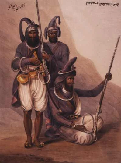 Sikhs with chakrams, inscribed "Nihang Abchal Nagar" (Nihang from Hazur Sahib), 1844.
